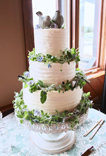 Plus, the first wedding cake I did was completely different from this one! It was an 8" round cake with fondant, sugar flowers, and cupcakes on the side. The wedding cake I did this time around was made up of TIERS, frosted with buttercream, and decorated with real greenery.